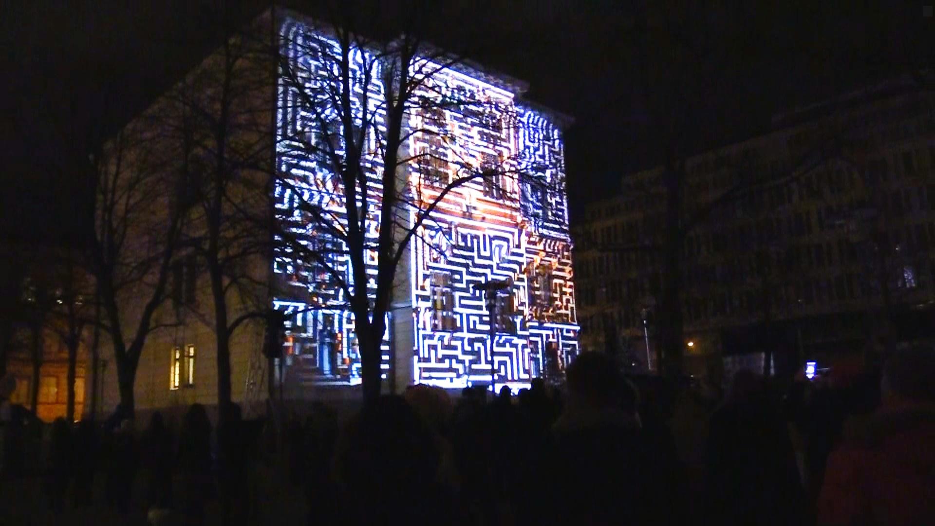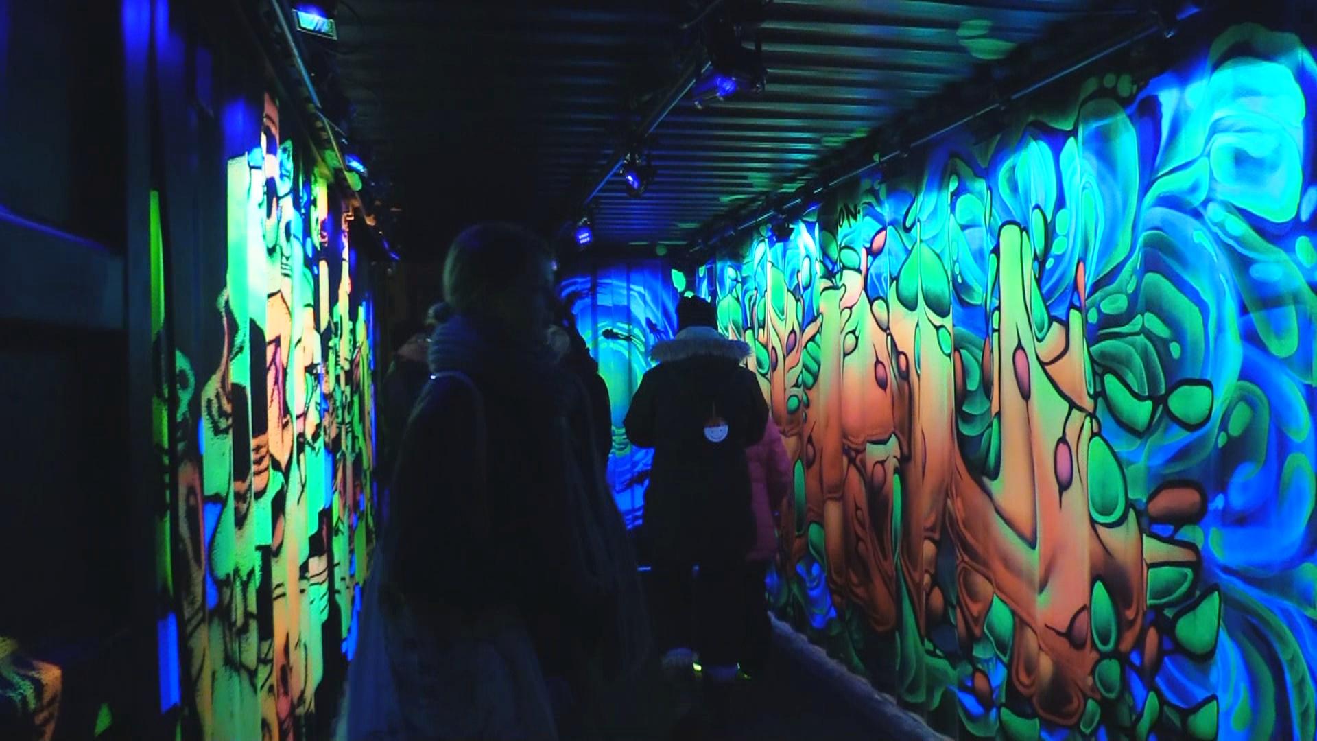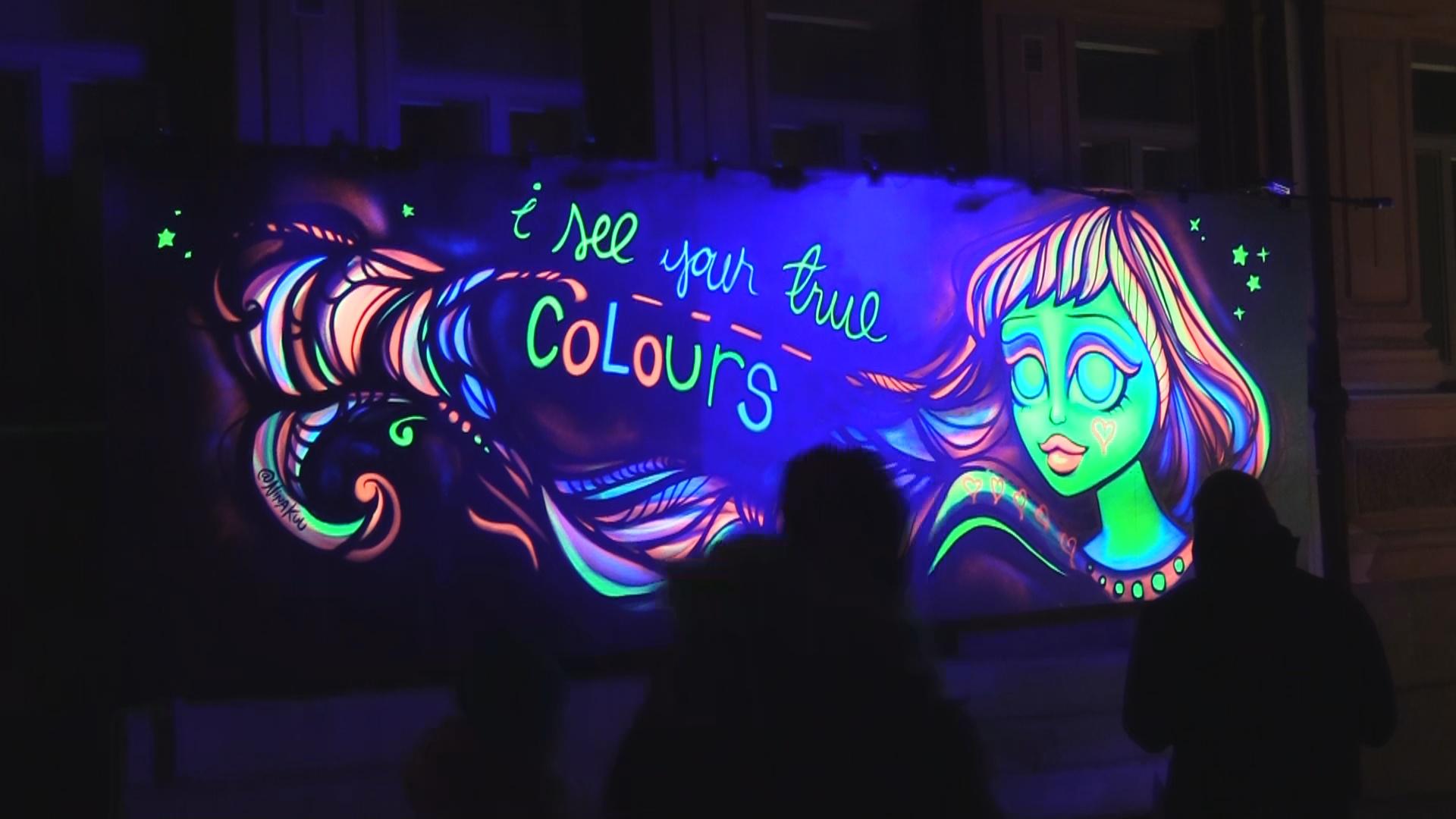 Jättimäisen seinälle heijastetun muuttuvan labyrintin jälkeen myös kaduilla pääsi nauttimaan uv-valoja hyödyntävästä taiteesta. Graffitimaalaukset ja erikoinen konttiteos esittelivät urbaanimpaa ja hivenen psykedeelisempää ilmaisua vastapainona valaistuille rakennuksille.