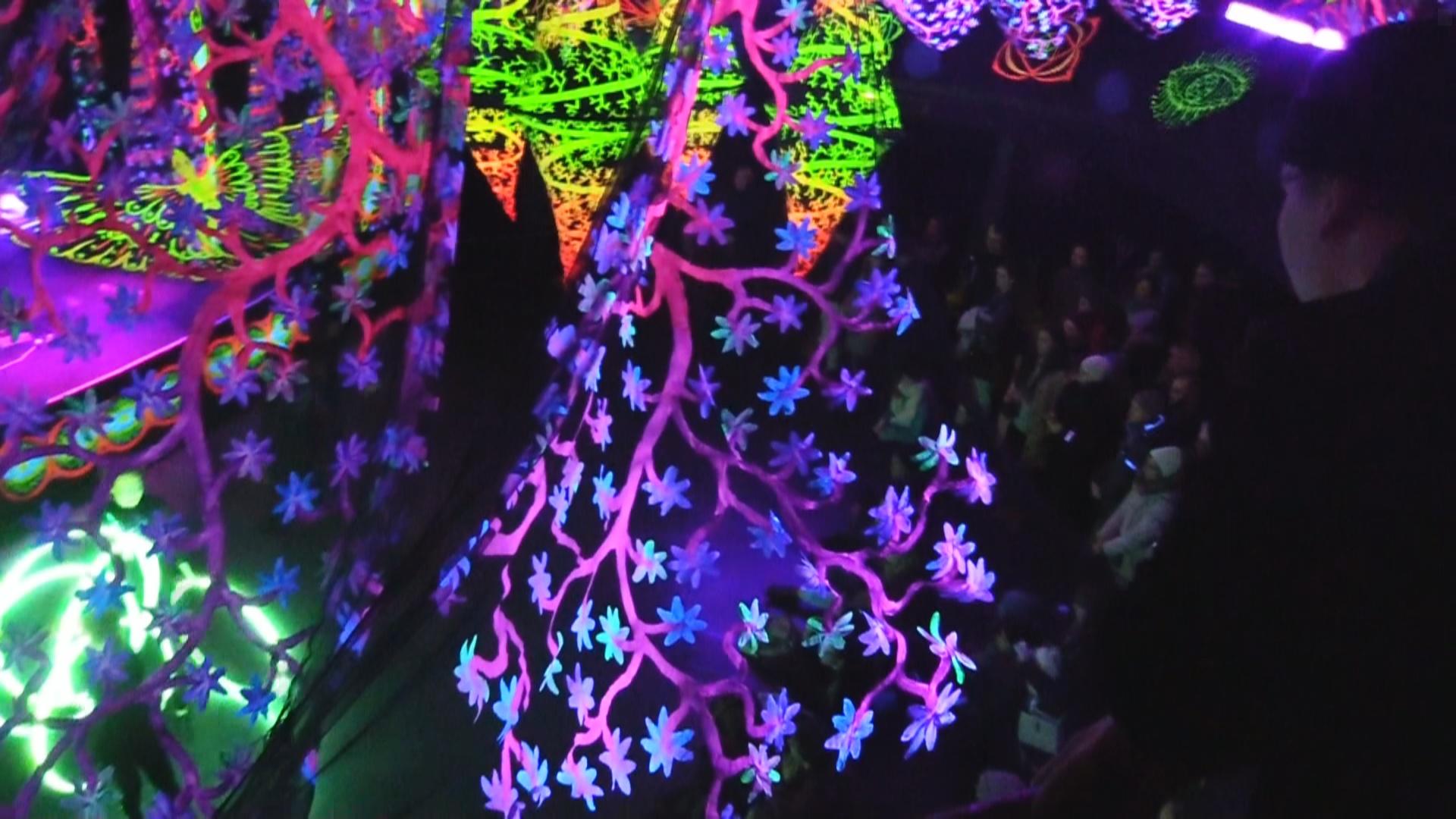Koleasta ulkoilmasta pääsi hetkeksi myös sisälle lämmittelemään. Kulttuuriareena Glorian sisällä ollut valoteos nousi henkilökohtaiseksi suosikikseni. Teatterin käytävät oli koristeltu uv-valossa hohtavilla kukkaiskoristeilla ja erilaisilla laservaloilla. Kokonaisuus huipentui valoja ja tanssia yhdistelevään esitykseen teatterin näyttämöllä. Taatusti illan värikkäin näky!
