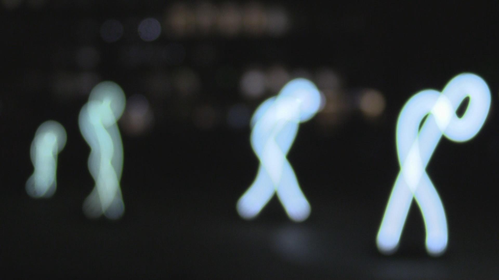 Kierros koukkasi Kasarmitorille, jossa esillä oli neonvaloista muodostuvia ihmishahmoja. Ohjelmaa tutkittuani teoksessa on kyse pakomatkalla olevasta pakolaisperheestä.