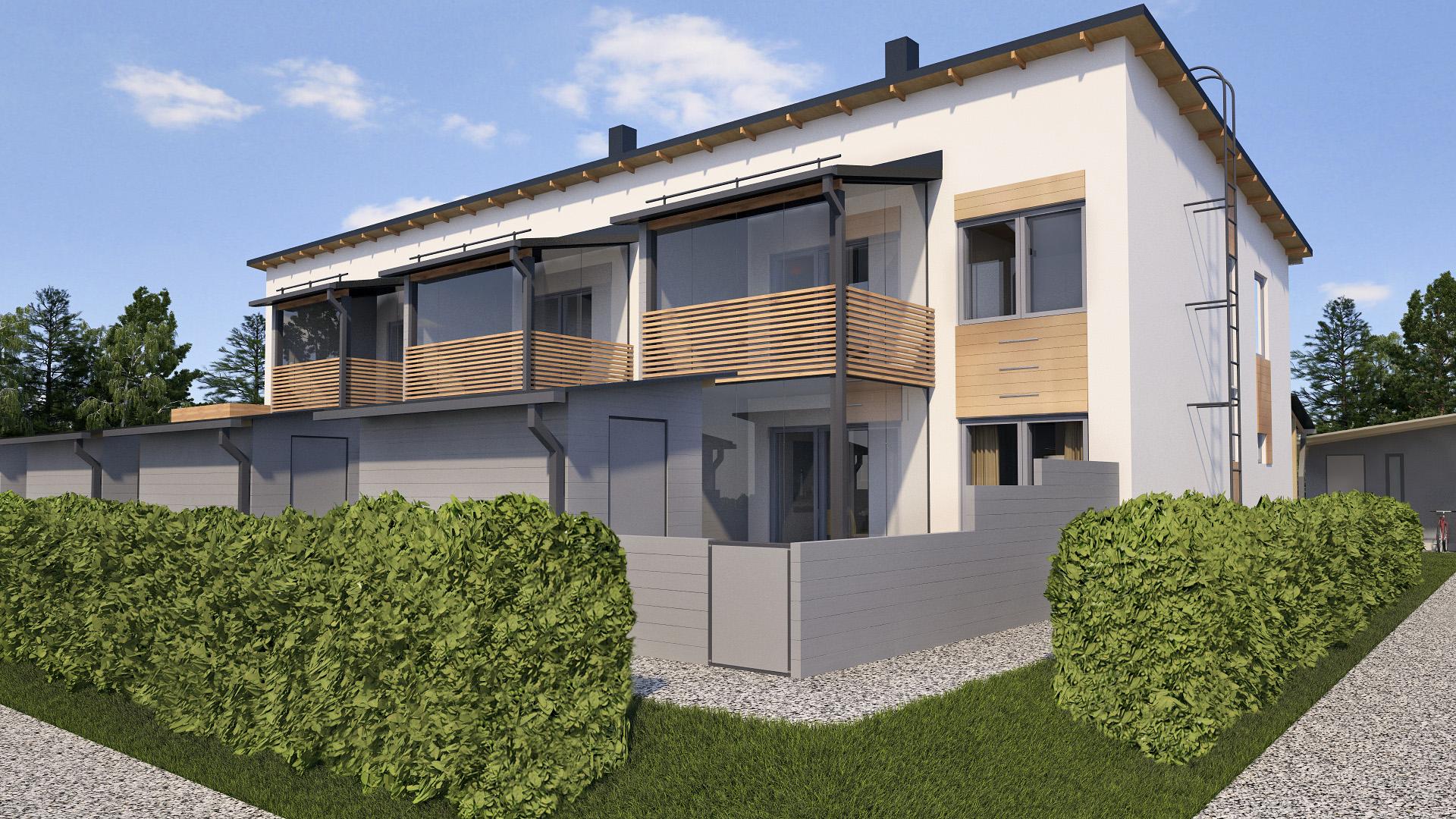 Kaikissa asunnoissa on lasitettu terassi, joka aukeaa oleskelutiloista viihtyisälle takapihalle. Piha rajautuu kaikilta sivuilta suojaisaksi ja yksityiseksi tilaksi. Arvokkaan tuntuinen kuusirimoitus yhdessä julkisivurappauksen kanssa luo elegantin tunnelman.