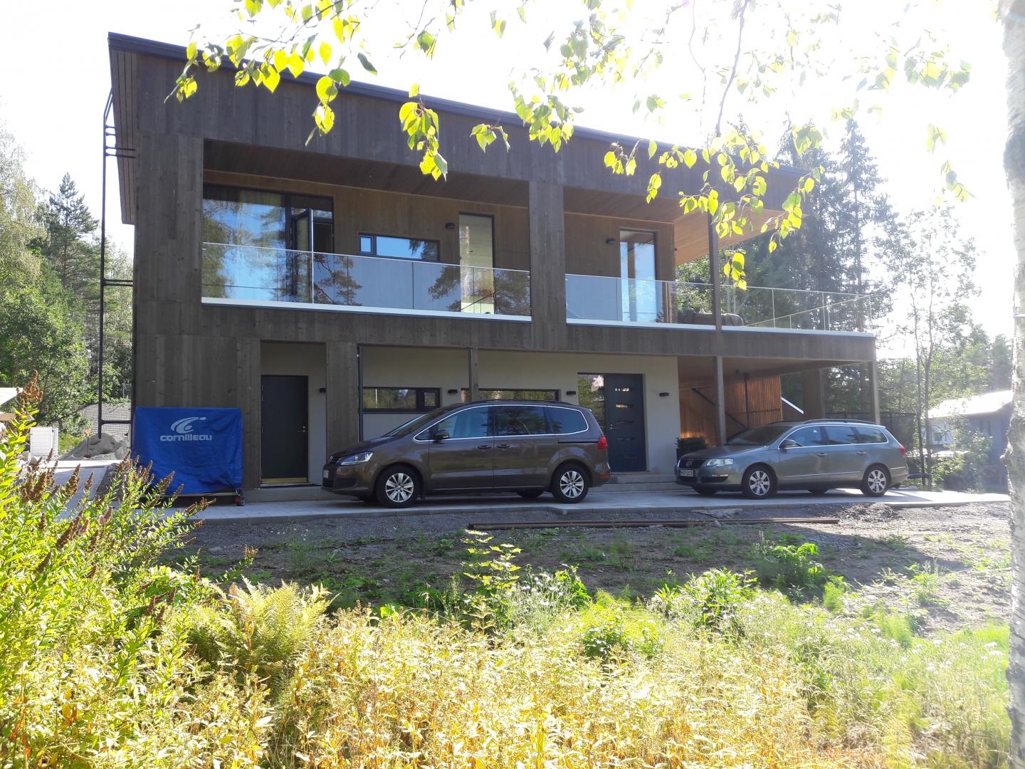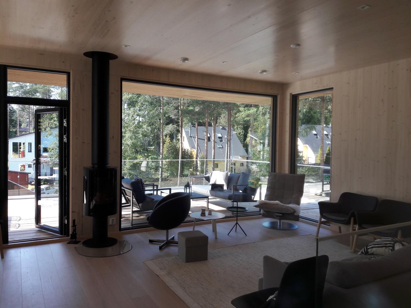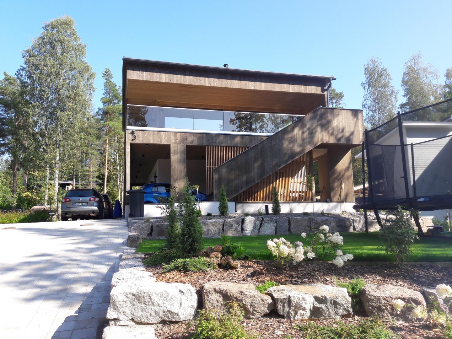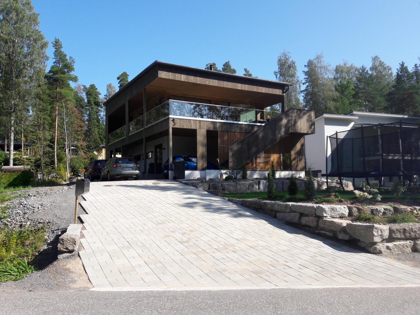 Kaksikerroksinen omakotitalo Espooseen. Talo on rakennettu teollisesti valmistetuista CLT-moduuleista, eli ristiinlaminoiduista massiivipuulevyistä. Rakenne on ilmatiivis eikä vaadi erillistä höyrynsulkua. Rakenne myös sitoo ja luovuttaa sekä tasaa huonetilan kosteutta. Myös rakennuksen julkisivut ovat samaa CLT-rakennetta.